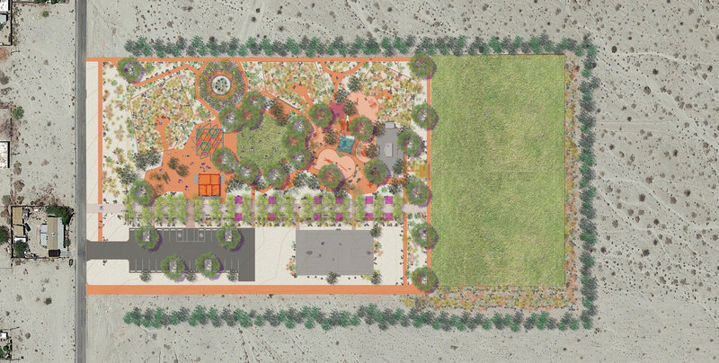 Zigzagging paths and locally-inspired planting stimulate exploration, while glyphs representing the park’s theme are incorporated in the pavilion and wayfinding. Women-led food cooperative Delicias Laguna Azul and youth-led bike share Desert Riderz are both based there.